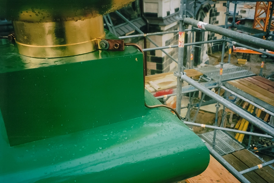 Wird eine historische Dachbekrönung restauriert, sorgen wir für die sichere Befestigung und die Integration in das bestehende Blitzschutzkonzept. So bleibt der Charakter Ihres Gebäudes erhalten und erfüllt trotzdem moderne Sicherheitsansprüche.