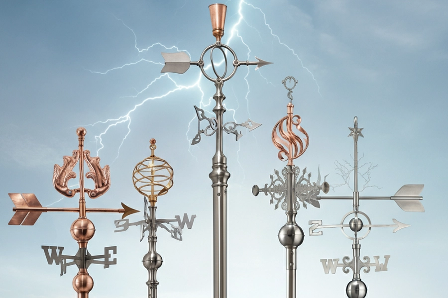 Wir beraten Sie bei der Auswahl hochwertiger Wetterfahnen aus Kupfer oder Edelstahl. Gemeinsam wählen wir Modelle aus renommierten Katalogen, ganz nach Ihrem Geschmack – klassisch, modern oder mit individuellem Motiv. Die Lieferung erfolgt direkt vom Hersteller, wir übernehmen die fachgerechte Montage und Integration in Ihr Blitzschutzsystem.